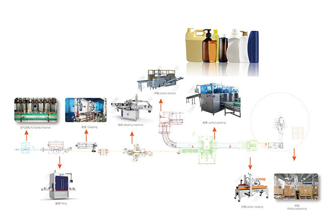 日化灌裝生產線,可用于液體、膏體的灌裝,如:洗發水、洗手液、洗滌劑、洗發水、洗發乳、沐浴露等灌裝,下面以洗發水灌裝生產線為例說明。