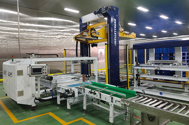 ③ 自動(dòng)完成進(jìn)箱、轉(zhuǎn)箱、分排、成堆、移堆、提堆、進(jìn)托、下堆、出垛等步驟;