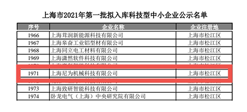 近日,根據《科技型中小企業評價辦法》,上海尼為機械科技有限公司被認定為上海市2021年第1批擬入庫科技型中小企業。這是我司在科技創新型企業發展道路上取得的喜人成果,是有關部門給予我司研發和創新能力的認可。