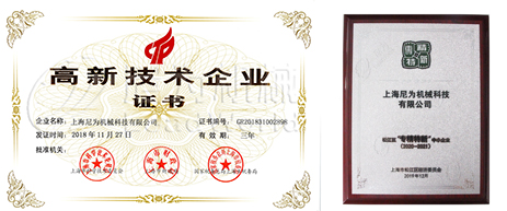 憑借過硬的創新能力和研發能力,上海尼為機械科技有限公司先后被評為“高新技術企業”、“專精 特新” 、“科技型中小企業”,見證了我司科技創新的雄厚實力。
